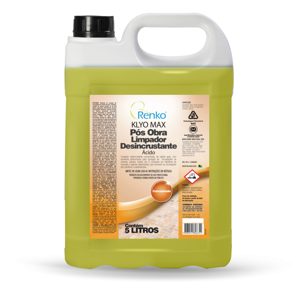 Klyo Max da Renko é limpador desincrustante concentrado, de rápida ação, com excelente performance, desenvolvido para remoção de incrustações de cimento, calcário, óxidos, etc. Possui em sua formula agentes dispersantes especiais e tensoativos com alto poder de limpeza e penetração que auxiliam na remoção eficaz de incrustações sem danificar a superfície.